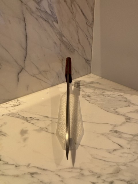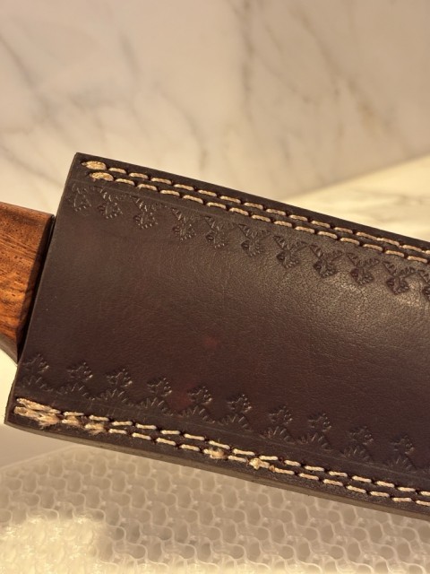 Jeg ønsket en kniv som er inspirert av den klassiske samekniven. Men jeg ønsket en kniv som virkelig skulle tåle skikkelig juling. Jeg har knekt 2 samekniver da de ikke er ordentlig fulltanget. Så denne kniven skulle virkelig tåle alt. Jeg tegnet og designet kniven i 2012. Men det var ikke bare å få en Norsk smed til å produsere opp til en fornuftig pris. Så designet lå i skuffen i mange år helt til jeg fant en som kunne hjelpe meg fra Pakistan. Sjeftet er laget av Rosewood og slira i skinn. Den er fantastisk god å holde i og sitter godt i hånden.
